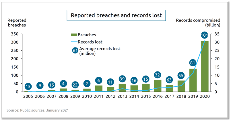 另一方面,数据泄露重大事件频繁发生,如2020年泄露数据记录数量超过310亿条,比2019年增长171%。仅2020年一年泄露的数据记录数量就已超过之前15年来的总和。