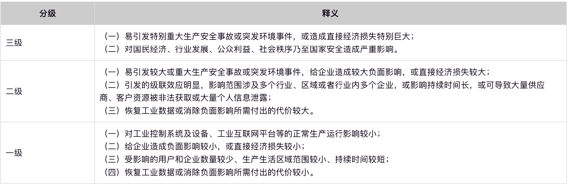 根据不同类别⼯业数据遭篡改、破坏、泄露或⾮法利⽤后,可能对⼯业⽣产、经济效益等带来的潜在影响,将⼯业数据分为⼀级、⼆级、三级等3个级别。