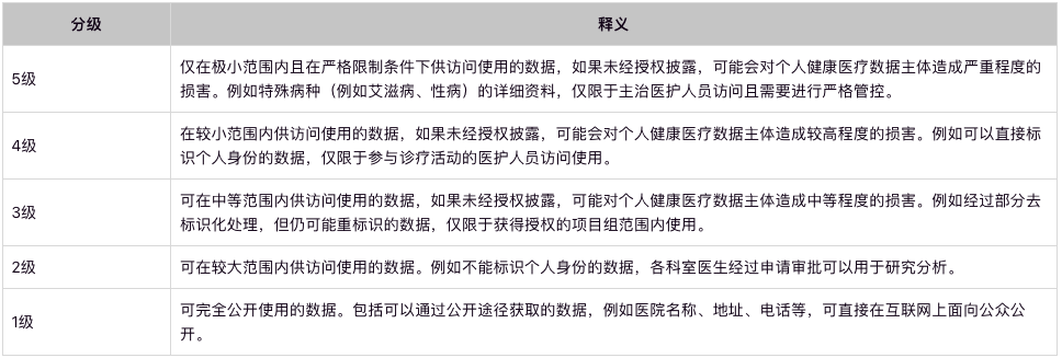 根据数据重要程度、⻛险级别以及对个⼈健康医疗数据主体可能造成的损害和影响的级别进⾏分级,可将健康医疗数据划分为以下5级:
